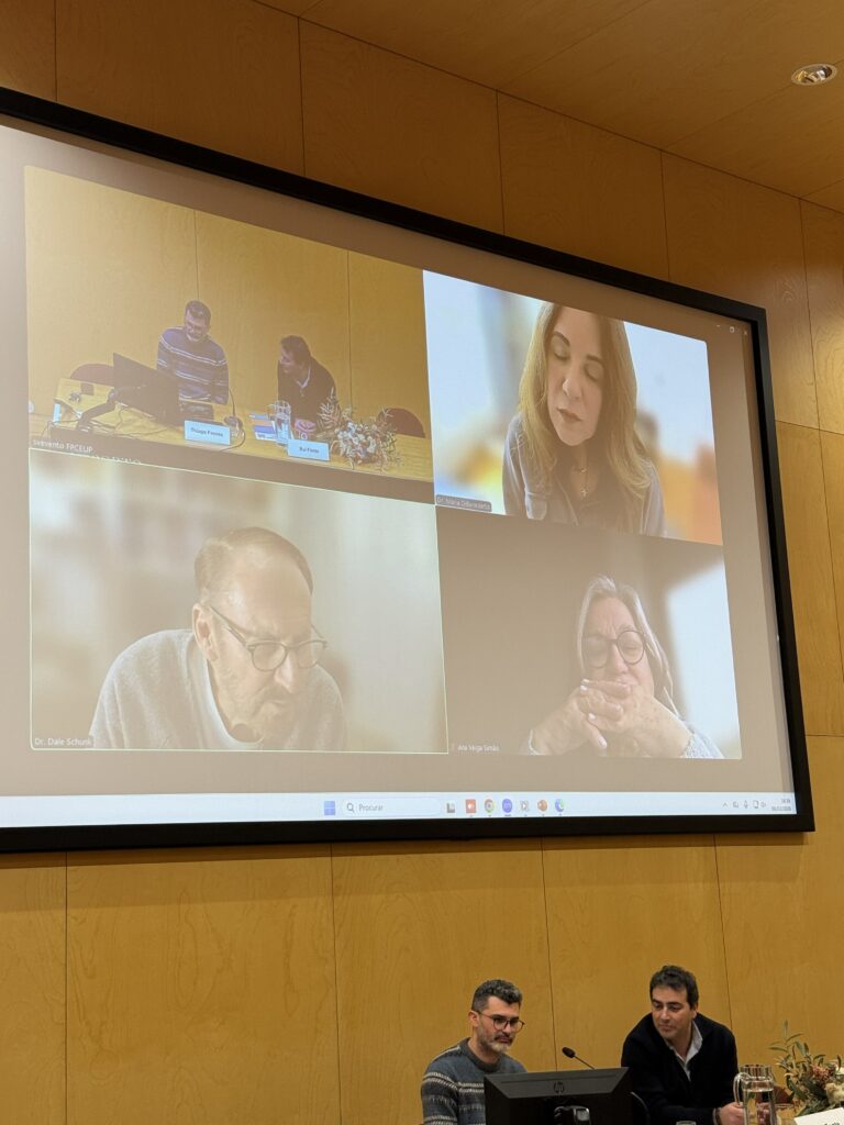 Seguiu-se a apresentação do vídeo do projeto e a conferência com os consultores Dale Schunk e Maria DiBenedetto, ambos da University of North Carolina at Greensboro (UNCG). Estes dois momentos foram conduzidos pelo investigador Thiago Freires (FPCEUP).